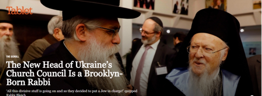 Ο γεννημένος στο Μπρούκλιν Yaakov Dov Bleich, ο επικεφαλής ραβίνος της Ουκρανίας, ανέλαβε την εκ περιτροπής προεδρία του ουκρανικού Συμβουλίου Εκκλησιών και Θρησκευτικών Οργανώσεων στις αρχές Ιουλίου. Θα τηρήσει τη θέση αυτή τουλάχιστον μέχρι το τέλος αυτού του έτους. Έτσι, οι πρώτοι Χριστουγεννιάτικοι εορτασμοί που θα πραγματοποιηθούν από μια ψευδώς »ενοποιημένη και ανεξάρτητη ουκρανική εκκλησία » (σσ. τη σχισματική που εσχάτως ίδρυσε ο Βαρθολομαίος και από την οποία η μεγαλύτερη Ορθόδοξη Εκκλησία Ουκρανίας με 12.000 ενορίες υπό δικαιοδοσία Μόσχας ) θα τελεστούν υπό την αιγίδα ενός εκκλησιαστικού συμβουλίου με επικεφαλής έναν ραβίνο.